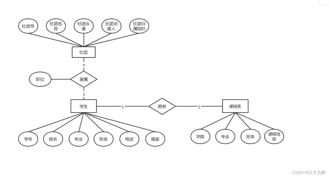 - 关系(Relationship):关系表示实体之间的联系和互动。关系可以是一对一、一对多或多对多的关系。在ER图中,关系通常用菱形表示,连接相关的实体,并用线表示关系的类型。
