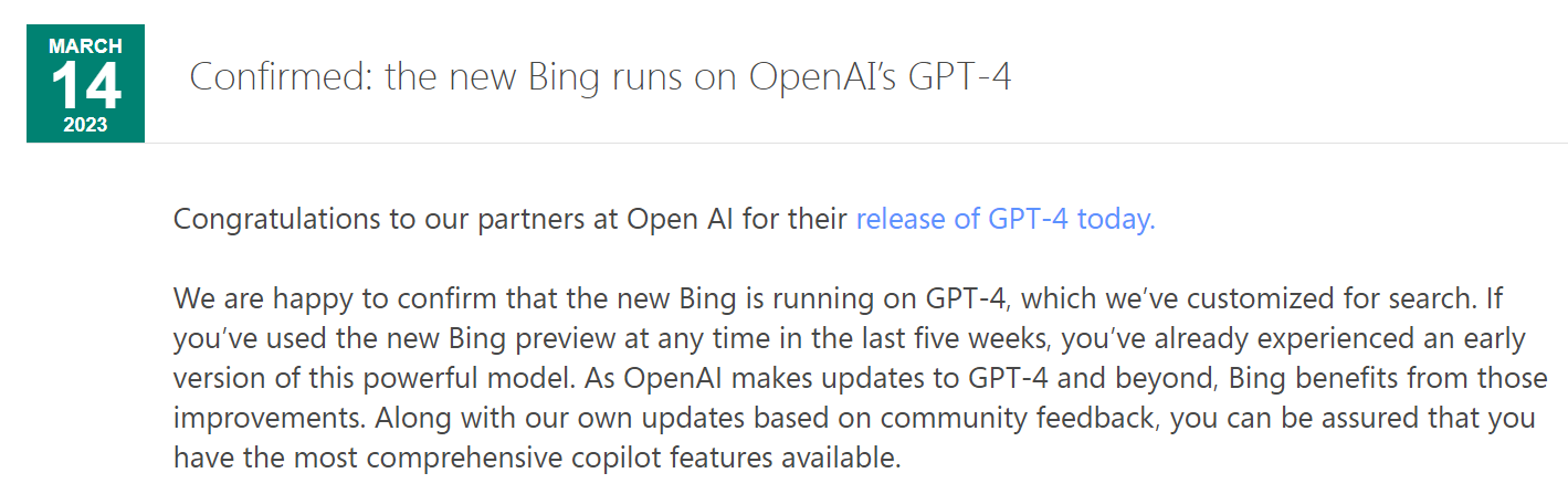 首先来看一则公告(Confirmed: the new Bing runs on OpenAI’s GPT-4):