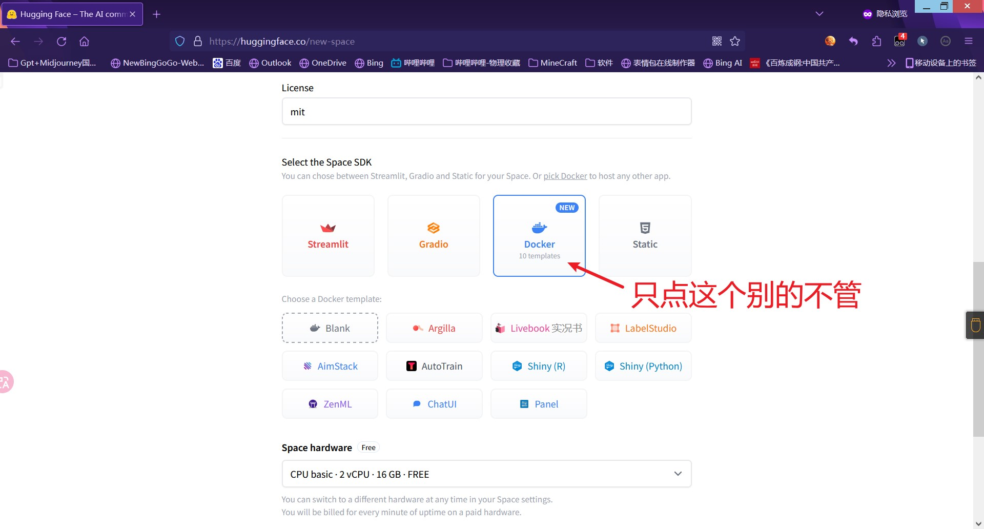 - Select the Space SDK选Docker,Choose a Docker template选Blank