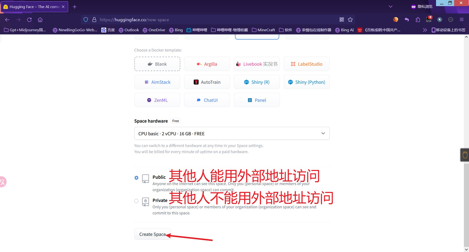 - Public——不在你组织或未登录的人能访问你的Space(公用)。