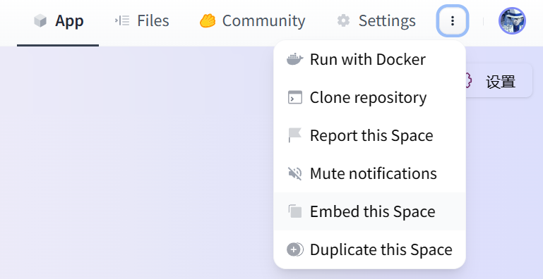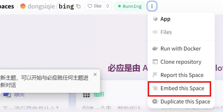 1.点上面的三个点(更多),然后再点 Embed this Space