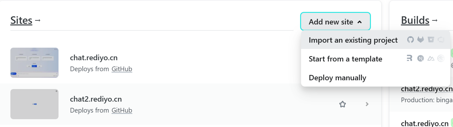 - Netfily注册之后,import an existing project,然后从关联的GitHub导入刚才的代码库即可一键构建。