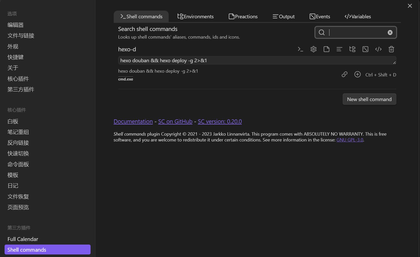 Obsidian 可以设置 一个模板文件 front matter,这样就不用使用终端执行 hexo new post 命令来生成带有 front matter 的文档,然后我主要说明一下 Obsidian Shell commands 插件的使用,这样我们写完文章后只需要使用快捷键进行部署。