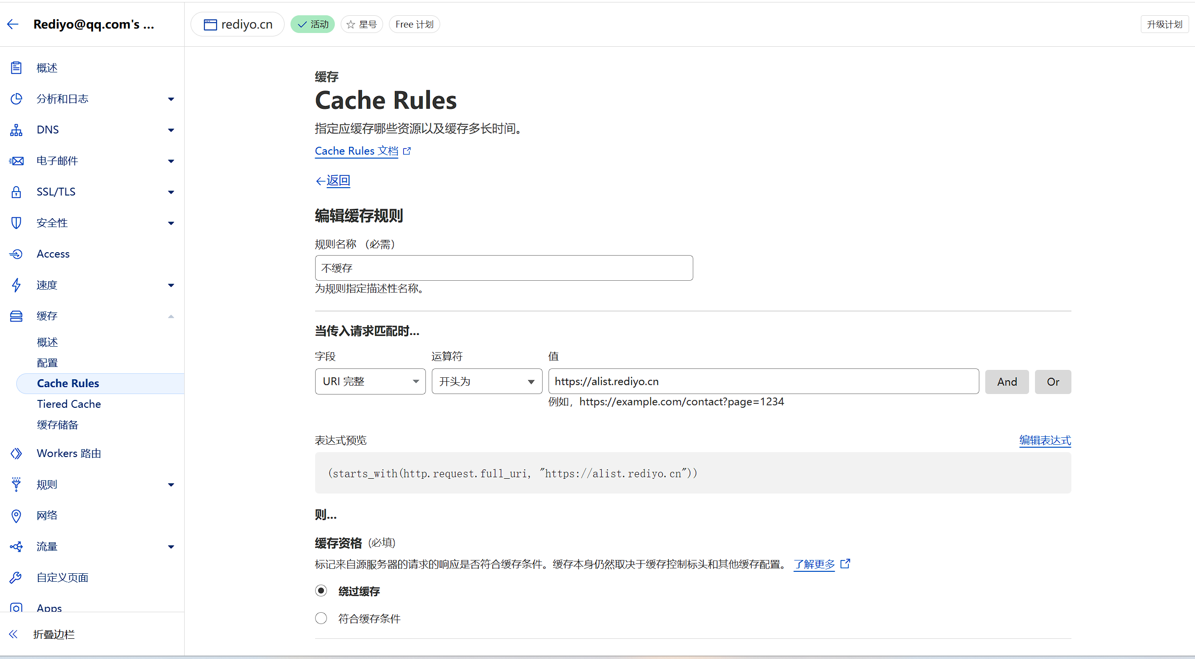 此外,由于在cloudflare服务设置了rediyo.cn的alist子域名dns解析到serv00应用,因此使用rediyo.cn的alist子域名访问serv00的alist应用时,cloudflare普通用户无法上传超过100mb的文件,因为cloudflare默认设置了缓存策略,因此需要绕过缓存,如下图所示。
